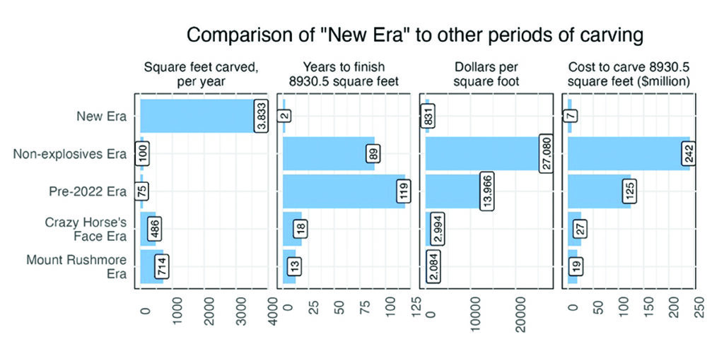 Since June of 2022, the pace of carving at Crazy Horse Memorial® has dramatically changed. From June of 2022 through September of 2024—a period of 2.3 years—an estimated 8930.5 square feet have been carved to within at most 1 inch of finished grade, with much of it being completely finished. In the last 2.3 years, we’ve seen progress that we would have expected to take a lifetime and hundreds of millions of dollars just a few years ago. Figure 2 illustrates this in terms of how long carving 8930.5 square feet would have taken in other periods, referred to here as “eras.” What has happened since June of 2022 is called the “New Era”—the stark contrast to other eras shows the reason for the name. In terms of the average square feet per year, the “New Era” is about 5.4 times faster than the “Mount Rushmore Era” and 7.9 times faster than “Crazy Horse’s Face Era.” “Pre-2022 Era” refers to the entire history of carving Crazy Horse Memorial® up to June of 2022; the “Non-explosives Era” starts in 2015 when we were advised by engineering consultants to not use explosives anymore and runs to June of 2022. The “New Era” is 38 and 51 times faster than these eras, respectively. Perhaps surprisingly, the “New Era” is also the most cost effective—note all numbers are inflation adjusted to 2022 dollars. The final column of Figure 2 shows the cost of carving 8,930.5 square feet (what’s been done since June of 2022). In the “New Era” it cost about $7.43 million, compared to $18.6 million for the “Mount Rushmore Era” and $26.7 million for the “Crazy Horse’s Face Era.” Of course, these were different eras when explosives were used. If we compare the “New Era” cost of $7.43 million to the “Non-explosives Era” cost of $242 million, we see that we carved 8,930.5 square feet for 3% of what it would have cost during the “Non-explosives Era.” The second column shows that what took us 2.3 years in the “New Era” would have taken 89.3 years in the “Non-explosives Era” and 119 years in the “Pre-2022 Era.”