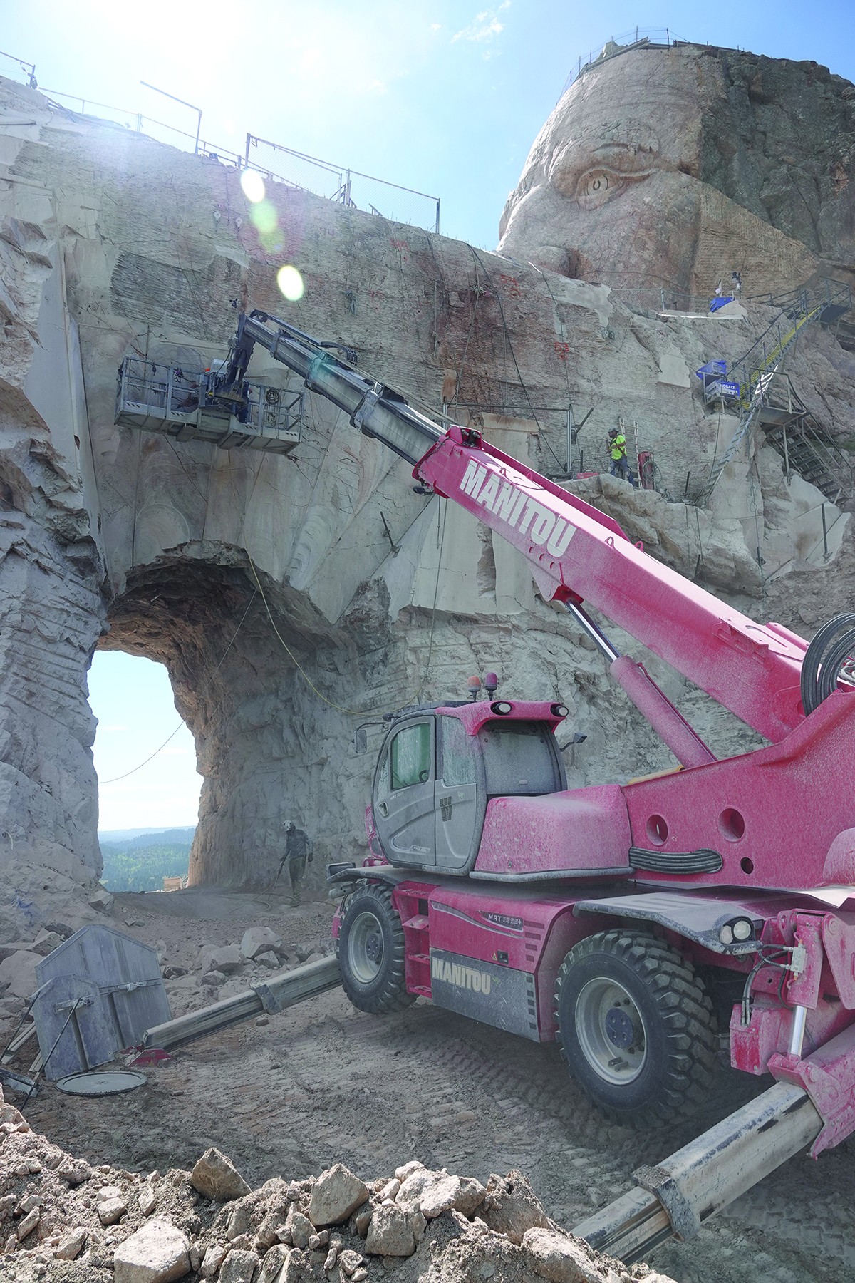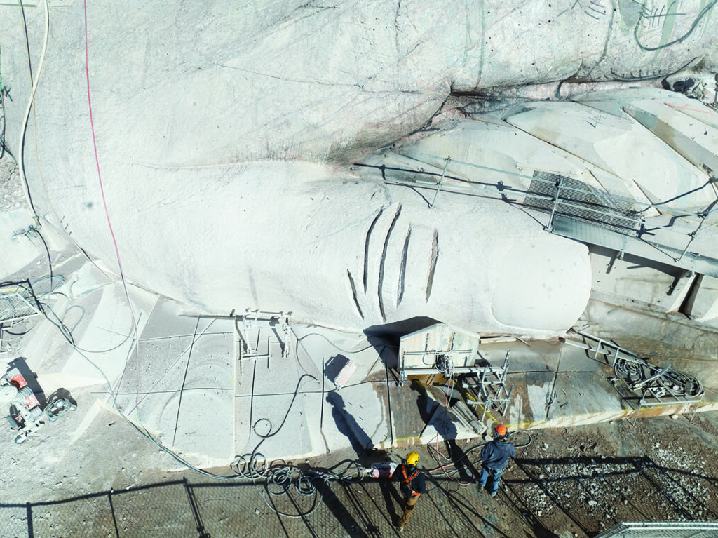 We had several other major projects which often took members of the crew away from removing rock. This reduced the raw number of people available to carve. Work on a new shop building, an innovative robotic arm, and installing a massive tower crane all demanded attention to different degrees. Further, the work on the back side of Crazy Horse’s Left Arm involves creating overhangs and expanding the opening of the tunnel, driving us to add significant rock support. More dowels have been put in the Mountain this year than any other year. We’ve completed most of an initial tunnel support plan that requires drilling around a miles worth of holes to install dowels. Most workdays, work on these dowels have taken 1 to 4 members of the Crew away from “carving.”
