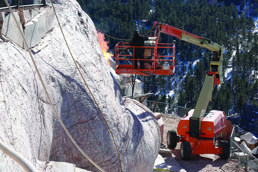 For most of the history of Crazy Horse Memorial®, carving took much longer than it did at Mount Rushmore. Over 74 years, about 5000 square feet were carved at Crazy Horse Memorial® (mostly Crazy Horse’s Face), compared to 10,000 square feet in 14 years at Mount Rushmore. This reflects a huge gap in resources, with government funding backing Mount Rushmore. It also reflects the need to remove far more rock at Crazy Horse Memorial® before finish work and detail carving could begin.
