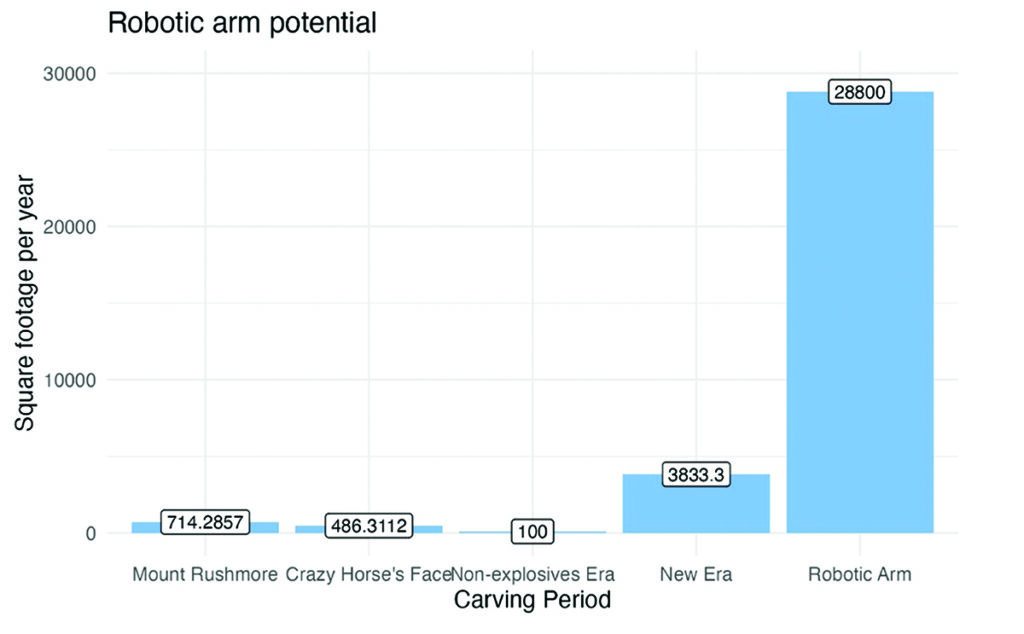 At the end of their trip in October of 2023, Nick and Tom also commented on what they saw as the capacity of the robotic arm. They said, based on seeing the site and the operation of the finishing saws, they thought, on a typical day, the robotic arm could finish a set up before noon. It could be reset and do another setup before the end of the day. Then, after we’ve done it 40 or 50 times and realize its reliability, we’ll check the evening weather and, if it looks clear, we’ll set it up a third time and let it run while we head home. Note that a “set up” for the robotic arm will carve around 80 square feet (the arm can reach 8 feet high has 10 feet of lateral travel. To get an idea for its size, watch the short, embedded video, “Size of the Robotic Arm.” The video shows a large man (Tom Bentley, around 6’4”) standing next to the frame for the robotic arm. If Tom and Nick’s judgment is correct, a typical day could see 240 square feet cut—leaving only torching and detail work to do. That is, in 2 days the arm could cover as much ground as the Crew did in a year of carving Crazy Horse’s Face. Put another way, 240 square feet a day could carve Mount Rushmore in 42 days—a couple of months if you take weekends off. Assuming the robotic arm completed 3 setups for only 120 days a year (there are 260 workdays a year), it could cover about 28,000 square feet. Figure 3 offers a comparison of this potential with other eras of mountain carving. The crucial question, Tom rightly pointed out, is whether we can finish other parts of the carving process quickly enough to keep the robotic arm busy. Doing so will be incredibly difficult. It could easily take years to accomplish that pace, if we ever do. Yet, it is a nice challenge to have.