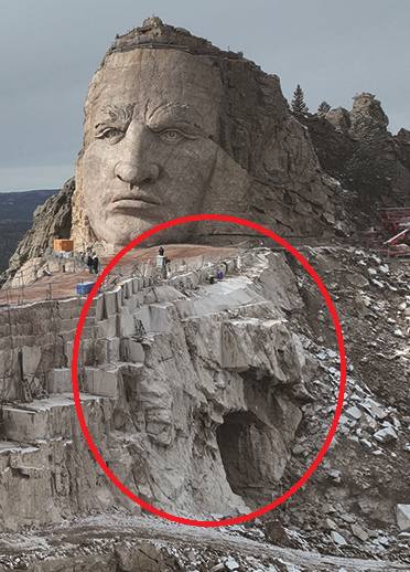 Consider Mount Rushmore. The height from the bottom of Lincoln’s face to the top of Washington’s head is approximately 90 feet. At a projected final height of 563 feet, this makes Crazy Horse Memorial® 6.25 times taller. While this sounds impressive, it understates the difference in size in important respects. For instance, the sheer amount of surface area that must be carved to complete Crazy Horse Memorial® is not only 6.25 times more than Mount Rushmore. At 641 feet long, Crazy Horse Memorial® will also be about 3.5 times wider than Mount Rushmore. Though only a two-dimensional comparison, this would lead to the estimate that Crazy Horse Memorial® will be 21.8 times larger than Mount Rushmore, substantially greater than 6.25 times larger.